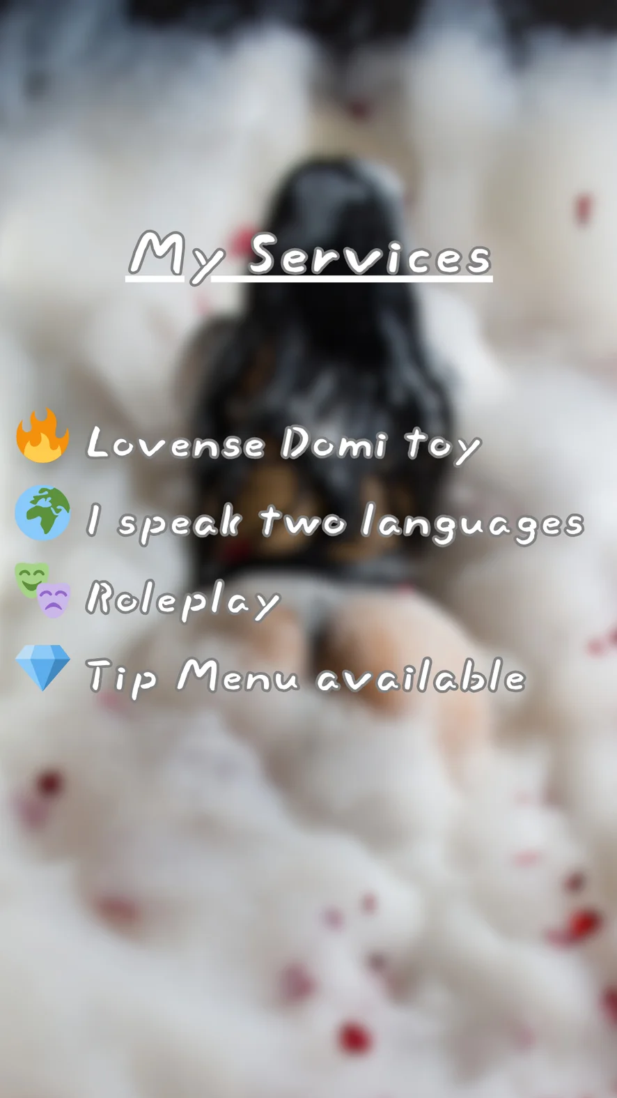 Догі-стайл, Ахеґао, Не вдома, Спанкінг, Еротичні танці, На кухні, Оцінювання прутня, Косплей, Шкіра, Мастурбація пальцями, Дилдо або вібратор, Брудні розмови, Душ, Стриптиз, Паління, Йога, Поза вершниці, Тверкінг, Топлес, Олійне шоу, Жорсткий секс, Фут-джоб, Оргазм, Між грудьми, Мінет, Латекс, Секс-іграшки, Фут-фетиш, Доміна, Верблюжа лапка, Кремпай, Сісти на обличчя, Кінчити на обличчя, Підбори, Сквірт, Мастурбація, Масаж, Лизання піхви, Іграшки для сосків, Рольові ігри, Інструкція з мастурбування, Приниження, Глибоке горло